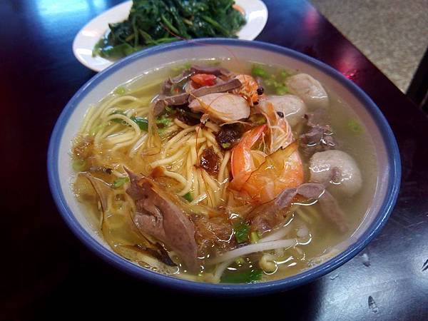 但仔細撈一撈,除了蝦子以外就是幾片貢丸和鵝胗鵝肝,我很那悶這不是海鮮麵嗎?
