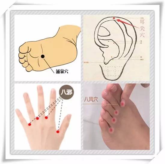 6、清熱解毒穴:耳尖、八邪、八風、湧泉穴