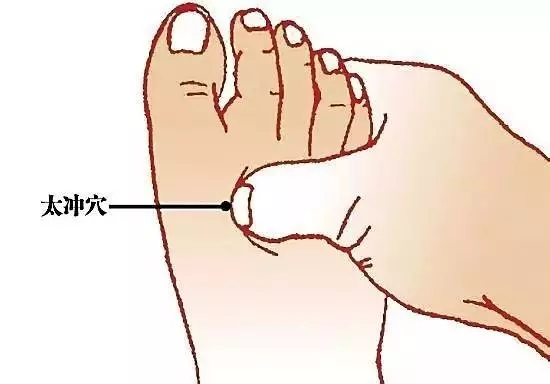 這是指太衝穴,位置在足背第一、二蹠骨結合部之前的凹陷中。用拇指按揉3~5分鐘,感覺輕微酸脹即可。不要用太大的力氣,兩隻腳交替按壓。